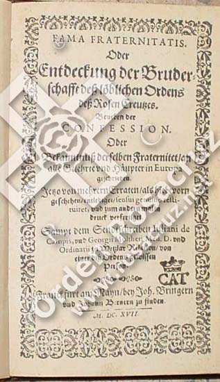 Von dieser Edition der “Fama Fraternitatis” sind weltweit nur DREI EXEMPLARE bekannt, eines befindet sich in der Universität von Illinois, ein weiteres in der Öffentlichen Bibliothek New York und das dritte ist dieses Exemplar, das sich im Hauptsitz des Rosenkreuz-Ordens befindet. |