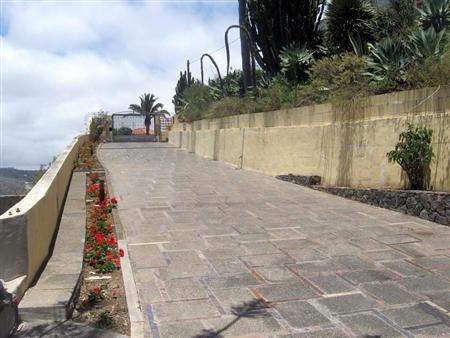 Die breite Zufahrt mit einem Tor aus Schmiedeeisen ist beidseitig von einer großen Vielfalt an Blumen, schönen Zierpflanzen und einheimischen kanarischen Gewächsen eingesäumt.