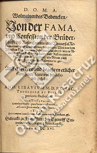 Dieses Buch beinhaltet eine kritische Sicht auf die Rosenkreuz-Manifeste Fama Fraternitatis und Confessio. Es ist geschrieben von Andreas Libavius, einem der scheinbaren „Kritiker“ des Rosenkreuzes, aber man weiß von ihm, dass er den Rosenkreuz-Großmeister Johann Valentin Andreae kannte und ein persönlicher Freund von ihm war. Womöglich war Libavius doch kein solcher Kritiker der Rosenkreuzer, wie es schien, denn außer seiner Freundschaft mit J.V. Andreae war er als Schüler des Paracelsus ein hervorragender Alchemist.